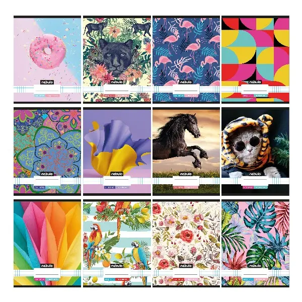 A/4-es tűzött iskolai négyzetrácsos füzet, 32 lapos (87-32). 12 db füzet (12 különböző minta) van egy csomagban. 70 g-os füzetlapok és 200 g-os műnyomó borító fényes fóliával.